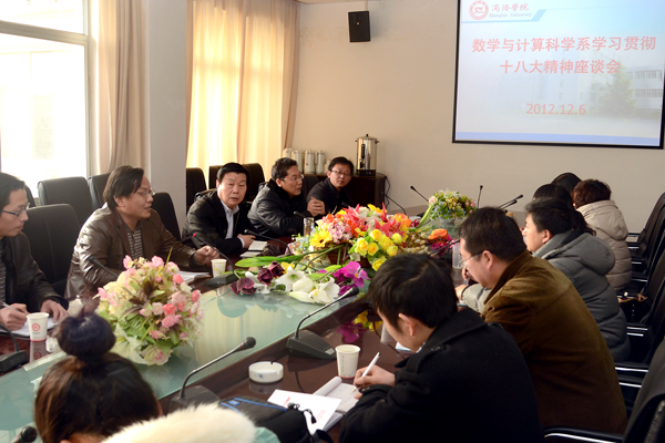12月6日下午,數學與計算科學系黨總支中心學習組舉辦學習黨的十八大精神座談會。院黨委副書記、院長張景書出席座談會并講話。數學與計算科學系黨總支副書記趙健主持座談。