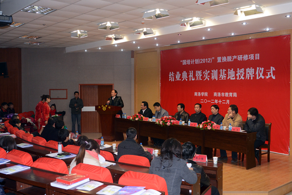 1212日上午,我院舉行“國(guó)培計(jì)劃(2012)”置換脫產(chǎn)研修項(xiàng)目結(jié)業(yè)典禮暨實(shí)訓(xùn)基地授牌儀式。院紀(jì)委書記、學(xué)院“國(guó)培計(jì)劃”和省級(jí)培訓(xùn)項(xiàng)目領(lǐng)導(dǎo)小組副組長(zhǎng)王思懷,商洛市教育局副局長(zhǎng)白發(fā)善,陜西省“國(guó)培計(jì)劃”項(xiàng)目執(zhí)行辦公室項(xiàng)目部主任蘇理、副主任羅昆山,我院中文系主任、學(xué)院“國(guó)培計(jì)劃”和省級(jí)培訓(xùn)項(xiàng)目領(lǐng)導(dǎo)小組成員黃元英,數(shù)學(xué)與計(jì)算科學(xué)系主任、學(xué)院“國(guó)培計(jì)劃”和省級(jí)培訓(xùn)項(xiàng)目領(lǐng)導(dǎo)小組成員李超,商洛市教育局基礎(chǔ)科科長(zhǎng)張斌出席了儀式。儀式由我院成人教育學(xué)院院長(zhǎng)任少儉主持。