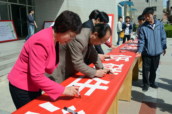 曾佳偉代表全校學(xué)生做了表態(tài)發(fā)言。出席儀式的領(lǐng)導(dǎo)和學(xué)生代表們在“節(jié)能減排,低碳生活”宣傳橫幅上簽名。