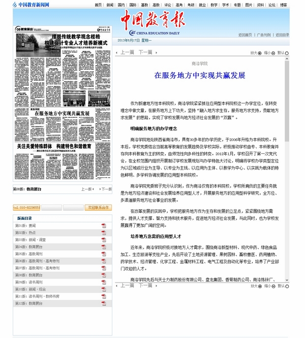 近年來(lái),在全校師生員工的共同努力下,我校教學(xué)科研工作取得了長(zhǎng)足的發(fā)展,教育教學(xué)成果豐碩、成就顯著,引起了社會(huì)各界的高度關(guān)注。6月17日,《中國(guó)教育報(bào)》刊登院長(zhǎng)張景書(shū)署名文章《商洛學(xué)院:在服務(wù)地方中實(shí)現(xiàn)共贏發(fā)展》,全面介紹了我校立足地方、服務(wù)地方,在建設(shè)特色鮮明、多學(xué)科協(xié)調(diào)發(fā)展的應(yīng)用型普通本科院校歷程中所做的工作和取得的成績(jī)。