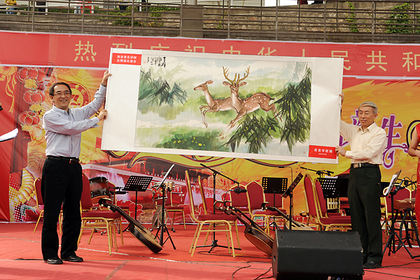 西安音樂學(xué)院黨委副書記、副院長(zhǎng)孫衛(wèi)國,商洛市政府副秘書長(zhǎng)劉仲林,校黨委書記張景書,黨委副書記、院長(zhǎng)劉建林,黨委副書記左曉民,紀(jì)委書記王思懷,副院長(zhǎng)陳永莊、魏書堂,商洛市教育局工會(huì)主席許丹莉,商洛聯(lián)通公司總經(jīng)理溫長(zhǎng)山,各系部、各職能部門黨政負(fù)責(zé)人和2013級(jí)全體新生一起觀看了演出。演出開始前,左曉民代表我校向西安音樂學(xué)院贈(zèng)送了我校藝術(shù)系主任劉鳳林創(chuàng)作的《吉祥雙鹿圖》,象征兩校之間友誼長(zhǎng)存。