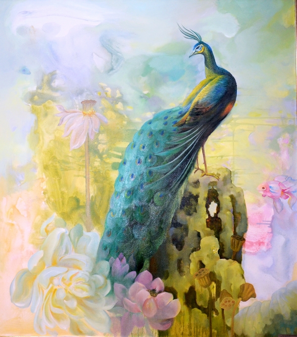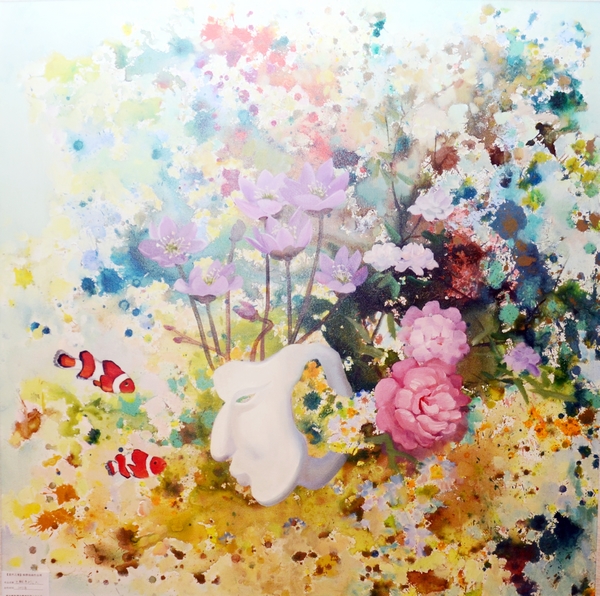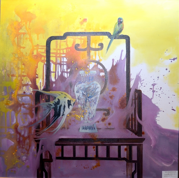 楊靜的作品多以意象風(fēng)景為主,魚、飛鳥、椅子、面具、鮮花常常成為畫面中的主要視覺符號,意象化的表述方式是其繪畫語言特點(diǎn),獨(dú)具視覺張力的畫面背后蘊(yùn)藏著或浪漫或神秘或抒情的藝術(shù)獨(dú)白。她的作品,一切似乎都是從畫布的縫隙間不經(jīng)意地流淌、蔓延而出,生發(fā)、幻化出諸多“意外之境”,堅(jiān)實(shí)的文化底蘊(yùn)與繪畫技能,獨(dú)到的藝術(shù)眼界和隨機(jī)靈動的“深思妙悟”,賦予畫面中各種意象生命,讓畫內(nèi)的意象引領(lǐng)聯(lián)想畫外意象,達(dá)成“象外之象,景外之景”的效果,結(jié)合自己的生命體驗(yàn)詮釋對當(dāng)代人及其生存環(huán)境的思索與追問,在虛實(shí)相生之間營造一個全新的美好境界。本次畫展共展出作品50多件,且全部被3家藝術(shù)投資機(jī)構(gòu)收藏。