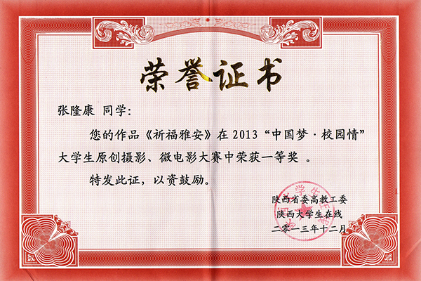 2013“中國夢?校園情”大學(xué)生原創(chuàng)攝影、微電影大賽由陜西省委高教工委和陜西大學(xué)生在線主辦,西北政法大學(xué)承辦,西安交通大學(xué)、西北農(nóng)林科技大學(xué)、西北工業(yè)大學(xué)、長安大學(xué)、西北大學(xué)、西安工程大學(xué)、西安文理學(xué)院、西安體育學(xué)院、西安翻譯學(xué)院協(xié)辦。大賽旨在深入貫徹落實(shí)十八大精神,推動(dòng)校園網(wǎng)絡(luò)文化建設(shè),提升陜西大學(xué)生的文化品位,豐富大學(xué)生的校園生活,宣傳和展示高校人文文化氛圍。大賽累計(jì)收到全省27所高校師生網(wǎng)上投稿作品3252幅,最終評選出攝影作品一等獎(jiǎng)5名,二等獎(jiǎng)10名,三等獎(jiǎng)13名,優(yōu)秀獎(jiǎng)14名;微電影作品一等獎(jiǎng)1名,二等獎(jiǎng)2名,三等獎(jiǎng)3名,優(yōu)秀獎(jiǎng)15名。