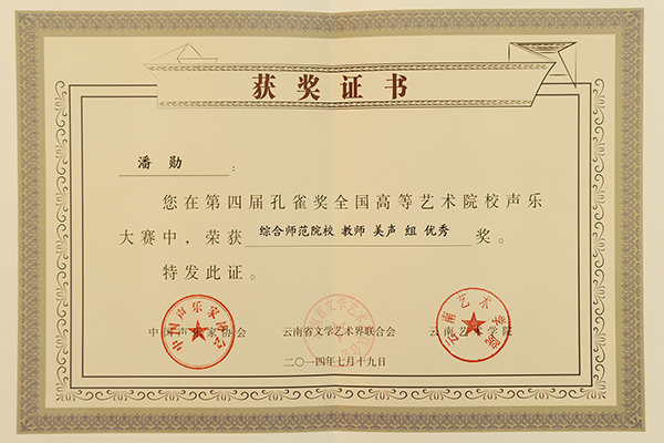 暑假期間,由中國(guó)聲樂家協(xié)會(huì)、云南省文學(xué)藝術(shù)界聯(lián)合會(huì)、云南藝術(shù)學(xué)院主辦的第四屆孔雀獎(jiǎng)全國(guó)高等藝術(shù)學(xué)校聲樂大賽在云南藝術(shù)學(xué)院音樂學(xué)院舉辦。我校藝術(shù)學(xué)院潘勛等5名師生參加比賽并獲得四項(xiàng)獎(jiǎng)勵(lì)。