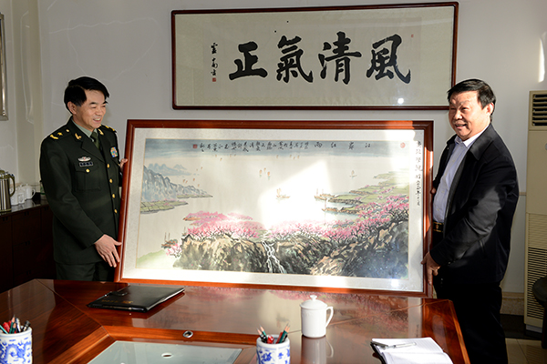 張景書代表我校向解放軍西安政治學(xué)院贈(zèng)送了一幅國畫《江岸紅雨》,寓意兩校合作軍地鋪新章,雨水化真情。李昆明向我?;刭?zèng)了解放軍西安政治學(xué)院水晶紀(jì)念版?;?。劉建林與李昆明分別代表兩校簽署了合作框架協(xié)議書。