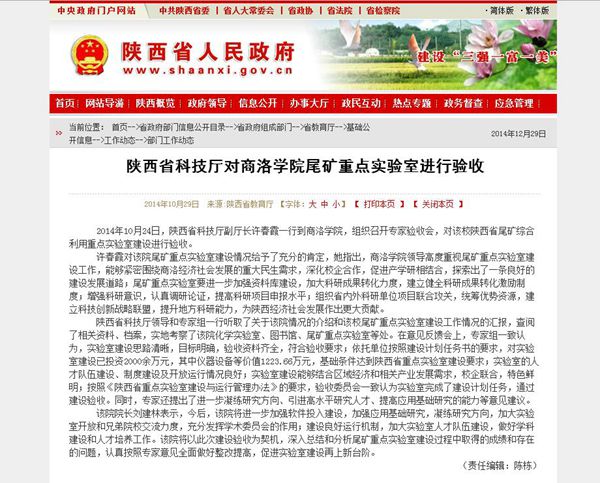 陜西省人民政府網(wǎng)站10月29日以《陜西省科技廳對商洛學(xué)院尾礦重點(diǎn)實(shí)驗(yàn)室進(jìn)行驗(yàn)收》進(jìn)行報(bào)道。(http://www.shaanxi.gov.cn/0/xxgk/1/2/4/22/35/39/124/42455.htm)