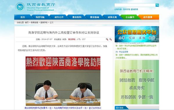 陜西省教育廳7月7日,以《商洛學(xué)院近期與海內(nèi)外三高校簽訂合作和對口支持協(xié)議》為題進(jìn)行報(bào)道。(http://www.snedu.gov.cn/jynews/gdxx/201407/07/42650.html)