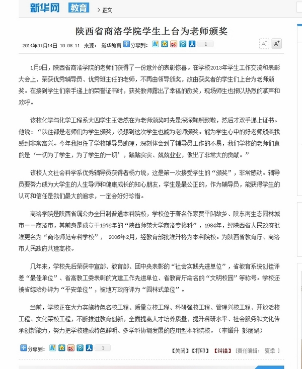 新華網(wǎng)1月14日以《陜西省商洛學(xué)院學(xué)生上臺(tái)為老師頒獎(jiǎng)》為題,對我校學(xué)生工作交流和表彰大會(huì)進(jìn)行了報(bào)道。(http://news.xinhuanet.com/edu/2014-01/14/c_126000991.htm)