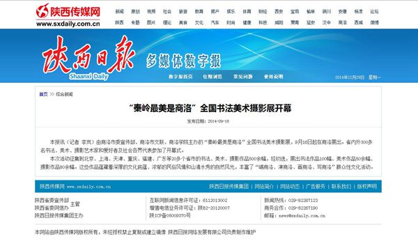 《陜西日報(bào)》9月18日,以《“秦嶺最美是商洛”全國書法美術(shù)攝影展開幕 》為題進(jìn)行報(bào)道。(http://esb.sxdaily.com.cn/tbarticle.do?epaper=viewarticle&AutoID=107438)