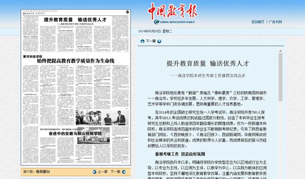 《中國教育報(bào)》5月20日以《提升教育質(zhì)量 輸送優(yōu)秀人才——商洛學(xué)院本科生考研工作抓得實(shí)亮點(diǎn)多》為題,(http://paper.jyb.cn/zgjyb/html/2014-05/20/content_417396.htm?div=-1)對我校本科生考研及學(xué)風(fēng)建設(shè)工作成就做了專題報(bào)道, 12月10日以《搭建資助平臺(tái) 傳遞愛心力量——商洛學(xué)院校企合作愛心助學(xué)側(cè)記》為題,對我校校企合作、捐資助學(xué)工作進(jìn)行了專題報(bào)道。(http://paper.jyb.cn/zgjyb/images/2014-12/10/12/L10.pdf )