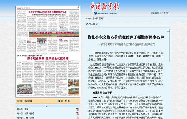 2月14日,《中國教育報》第4版以《將社會主義核心價值觀的種子播撒到師生心中》為題,對我校培育和踐行社會主義核心價值觀宣講活動進行了報道。該文一經(jīng)刊發(fā),人民網(wǎng)、新華網(wǎng)、中國網(wǎng)、中國日報網(wǎng)、環(huán)球網(wǎng)、中國青年網(wǎng)、網(wǎng)易、騰訊網(wǎng)等全國各大媒體紛紛轉(zhuǎn)載,在社會上引起了強烈反響。