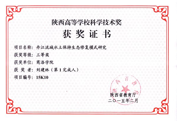 根據(jù)陜西省教育廳《關(guān)于公布2015年度陜西高等學(xué)??茖W(xué)技術(shù)獎的通知》(陜教技〔2015〕3號),由我校劉建林教授主持申報的《丹江流域水土保持生態(tài)修復(fù)模式研究》,榮獲2015年度陜西高等學(xué)??茖W(xué)技術(shù)獎三等獎。