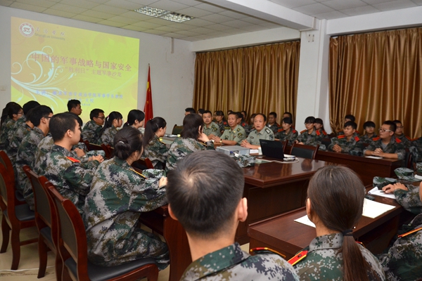 2015年9月9日,我校召開中國軍事戰(zhàn)略與國家安全主題座談會。解放軍西安政治學(xué)院軍事學(xué)系教授、2015級新生軍訓(xùn)團(tuán)團(tuán)長劉京生大校,軍訓(xùn)團(tuán)副團(tuán)長莊超中校,軍訓(xùn)團(tuán)副團(tuán)長伊明強(qiáng)少校出席本次活動(dòng)。武裝部部長、軍訓(xùn)團(tuán)政委石啟英主持座談。
