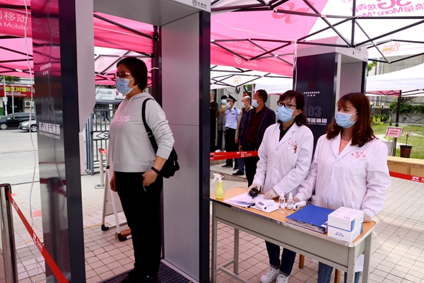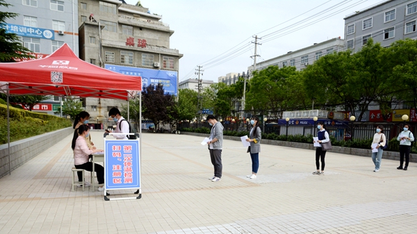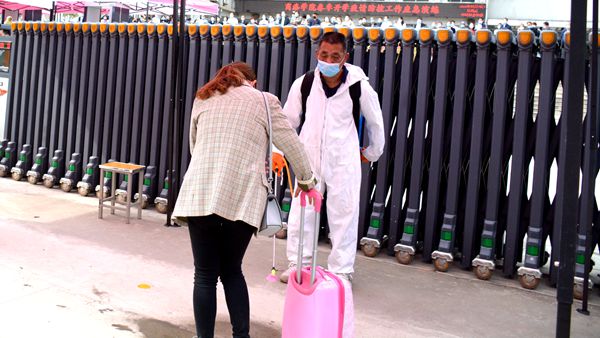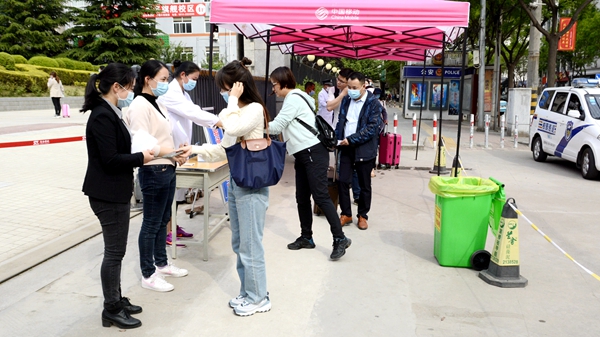 隨著龍治剛“演練開(kāi)始”一聲令下,緊張有序的演練正式拉開(kāi)帷幕,幾十余名“學(xué)生”在學(xué)校大門口外保持1.5米間隔依次進(jìn)入消毒通道,卸下舊口罩投棄到專用垃圾箱后佩戴工作人員配發(fā)的一次性醫(yī)用口罩,經(jīng)工作人員查驗(yàn)有效證件后進(jìn)入校門口自動(dòng)測(cè)溫門,進(jìn)行第一次體溫檢測(cè)。體溫檢測(cè)正常的學(xué)生按照指示線到一號(hào)教學(xué)樓前的各學(xué)院接待點(diǎn)接受二次體溫檢測(cè)、掃描驗(yàn)證健康二維碼、填寫健康承諾書。