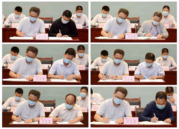 黨委書記龍治剛與職能部門、教學(xué)院(部)負(fù)責(zé)人代表分別簽訂了2020年度《全面從嚴(yán)治黨責(zé)任書》《意識(shí)形態(tài)工作責(zé)任書》和《穩(wěn)定安全工作責(zé)任書》。黨委副書記、校長范新會(huì)主持會(huì)議,黨委副書記彭虎軍宣讀表彰文件。