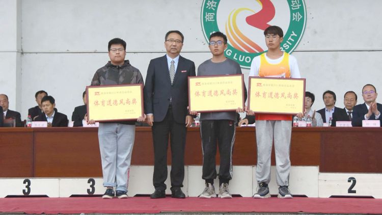 在熱烈的掌聲中,黨委書記龍治剛為獲得體育道德風尚獎的團體頒獎,校長范新會為男女團體總分前三名頒獎,副校長郭瑾為男子及女子團體總分前三名頒獎。