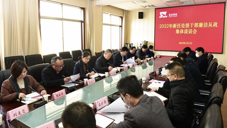 3月3日上午,我校召開2022年新任處級干部廉潔從政集體談話會。校黨委書記張志昌出席會議并講話,黨委副書記彭虎軍主持會議。紀委、組織部負責(zé)人及21名新任處級干部參加會議。