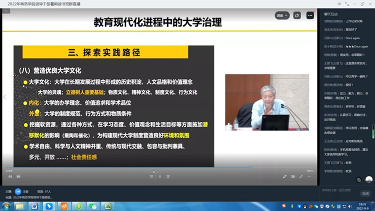 按照省委教育工委、省教育廳統(tǒng)一安排,9月8日至9日,我校105名處級以上領(lǐng)導(dǎo)干部參加了由省委教育工委主辦的2022年全省高校領(lǐng)導(dǎo)干部暑期讀書班。結(jié)合當(dāng)前疫情防控形勢,本次讀書班采用線上視頻會議形式舉行。
