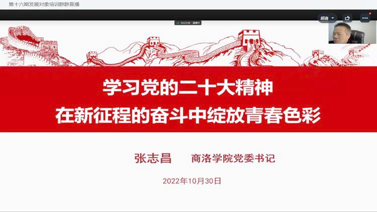 為深入學(xué)習(xí)貫徹黨的二十大精神,切實做好黨員發(fā)展工作,嚴(yán)格把好發(fā)展黨員“入口關(guān)”,強(qiáng)化發(fā)展對象的黨性意識,保證黨員發(fā)展質(zhì)量,10月30日至11月7日,我校組織開展了第十六期黨員發(fā)展對象培訓(xùn)活動。校黨委書記張志昌、黨委副書記彭虎軍先后在線為本期發(fā)展對象作專題輔導(dǎo)報告。