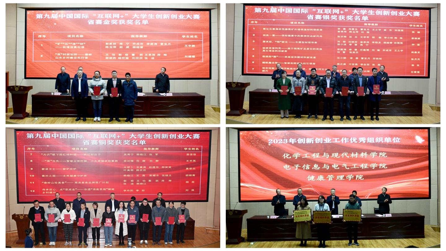 本次大會(huì)分為兩個(gè)階段,第一階段總結(jié)表彰我校榮獲2023年創(chuàng)新創(chuàng)業(yè)工作優(yōu)秀組織單位、優(yōu)秀指導(dǎo)教師、第九屆中國國際“互聯(lián)網(wǎng)+”大學(xué)生創(chuàng)新創(chuàng)業(yè)大賽省賽金獎(jiǎng)、銀獎(jiǎng)、銅獎(jiǎng)團(tuán)隊(duì),并為第二屆“商洛學(xué)院創(chuàng)新創(chuàng)業(yè)學(xué)院”校級導(dǎo)師頒發(fā)了聘書。優(yōu)秀組織單位代表電子信息與電氣工程學(xué)院院長袁訓(xùn)鋒、優(yōu)秀指導(dǎo)教師代表王思雨、獲獎(jiǎng)學(xué)生代表建工學(xué)院城鄉(xiāng)規(guī)劃專業(yè)房志明、化材學(xué)院資源循環(huán)與利用專業(yè)王宇鶴分別作了交流發(fā)言。