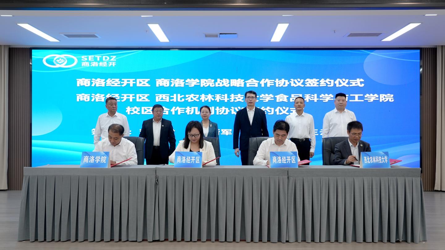 為推動(dòng)校區(qū)合作和產(chǎn)學(xué)研深度融合,提升商洛經(jīng)濟(jì)技術(shù)開發(fā)區(qū)科技創(chuàng)新與經(jīng)濟(jì)發(fā)展效能,9月29日,商洛經(jīng)開區(qū)校區(qū)合作共建食品產(chǎn)業(yè)園簽字儀式在商洛市舉行。商洛市委副書記、商洛經(jīng)開區(qū)黨工委書記趙孝,洛南縣委書記楊長江,校長權(quán)雅寧、副校長王新軍出席簽約儀式。趙孝、權(quán)雅寧共同為“商洛學(xué)院陜西省大學(xué)科技園綠色食品產(chǎn)學(xué)研示范基地”和“商洛學(xué)院電商直播實(shí)踐教學(xué)基地”揭牌。王新軍代表學(xué)校和商洛經(jīng)開區(qū)黨工委副書記蔣金君簽署戰(zhàn)略合作協(xié)議。簽約儀式由商洛經(jīng)開區(qū)管委會(huì)主任彭書旺主持。