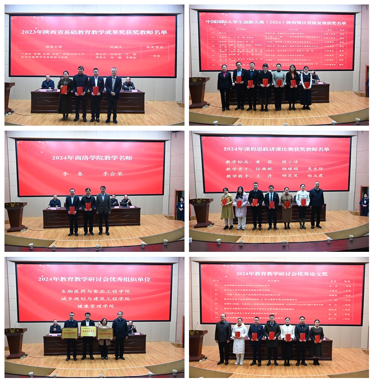 大會(huì)表彰了我校2023年陜西省基礎(chǔ)教育教學(xué)成果獎(jiǎng)獲獎(jiǎng)教師、中國(guó)國(guó)際大學(xué)生創(chuàng)新大賽(2024)陜西賽區(qū)省級(jí)復(fù)賽獲獎(jiǎng)項(xiàng)目、2024年商洛學(xué)院教學(xué)名師、2024年課程思政講課比賽獲獎(jiǎng)教師、2024年教育教學(xué)研討會(huì)優(yōu)秀組織單位、2024年教育教學(xué)研討會(huì)優(yōu)秀論文獎(jiǎng)獲獎(jiǎng)教師。