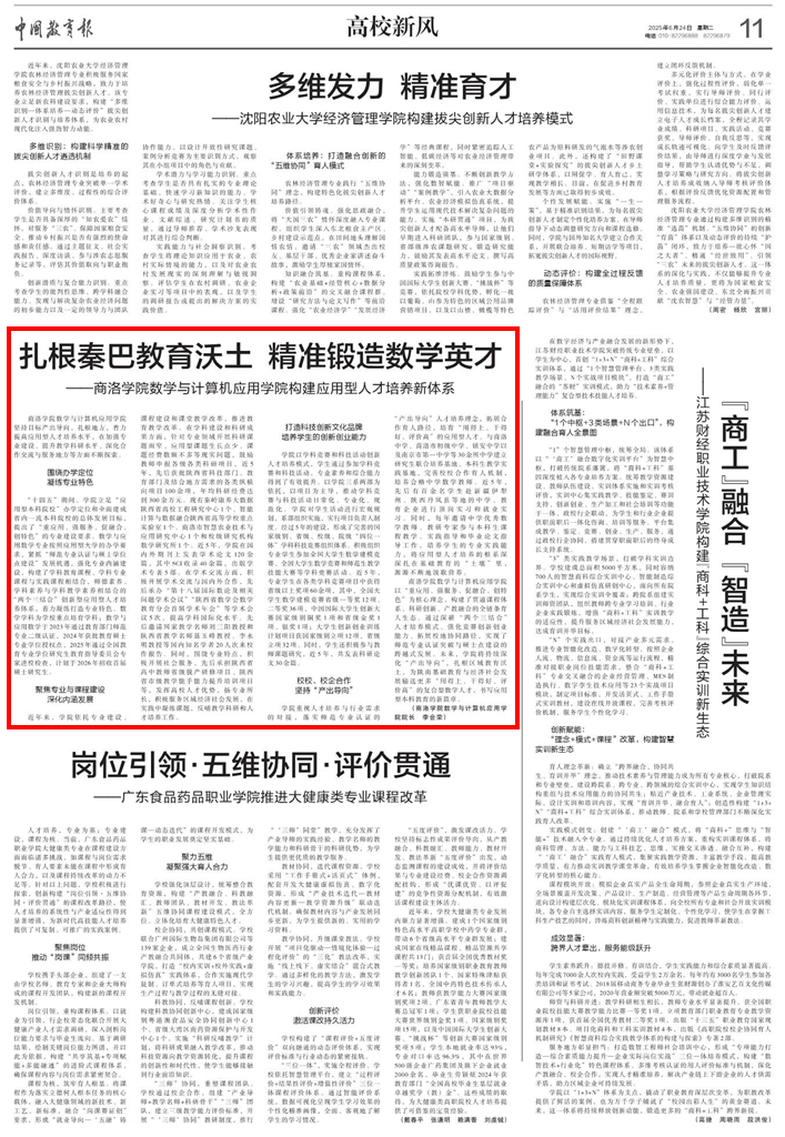 6月24日,《中國(guó)教育報(bào)》“高校新風(fēng)”版面以《扎根秦巴教育沃土精準(zhǔn)鍛造數(shù)學(xué)英才——商洛學(xué)院數(shù)學(xué)與計(jì)算機(jī)應(yīng)用學(xué)院構(gòu)建應(yīng)用型人才培養(yǎng)新體系》為題刊發(fā)專題報(bào)道。文章從“圍繞辦學(xué)定位凝練專業(yè)特色”“聚焦專業(yè)與課程建設(shè)深化內(nèi)涵發(fā)展”“打造科技創(chuàng)新文化品牌培養(yǎng)學(xué)生的創(chuàng)新創(chuàng)業(yè)能力”“校校、校企合作堅(jiān)持‘產(chǎn)出導(dǎo)向’”四個(gè)方面全面介紹了我校數(shù)計(jì)學(xué)院扎根地方構(gòu)建應(yīng)用型數(shù)學(xué)人才培養(yǎng)新體系的實(shí)踐探索和成果經(jīng)驗(yàn)。