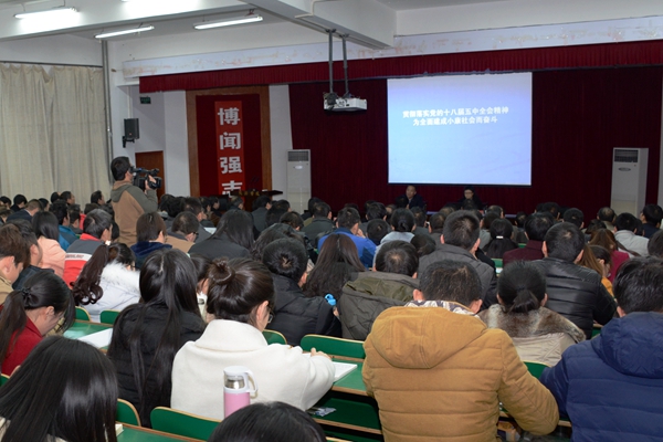 為進(jìn)一步推動(dòng)我校師生學(xué)習(xí)貫徹落實(shí)十八屆五中全會(huì)精神,12月9日,學(xué)校邀請(qǐng)陜西省委理論講師團(tuán)副團(tuán)長(zhǎng)黨寧教授為師生做了題為《貫徹落實(shí)黨的十八屆五中全會(huì)精神,為全面建成小康社會(huì)而奮斗》的專題報(bào)告。校黨委委員范新會(huì)、王思懷、魏書堂、彭虎軍、劉寶盈、劉端森、高榮發(fā),全校科級(jí)以上領(lǐng)導(dǎo)干部、輔導(dǎo)員,思政部、人文學(xué)院政教系全體教師,“青馬”工程學(xué)員和學(xué)生代表聽取了報(bào)告。報(bào)告會(huì)由紀(jì)委書記王思懷主持。