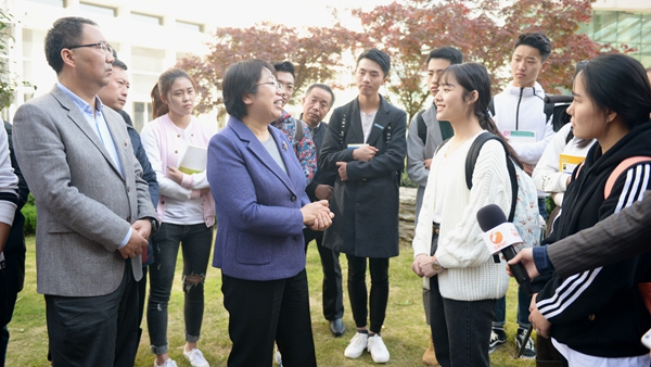 報告一結(jié)束,師生們便圍到陳俊身邊進行交流。她說,國家高度重視高等教育發(fā)展和青年人才培養(yǎng),學校要做好做強“四個一流”建設(shè),結(jié)合專業(yè)優(yōu)勢和商洛特色產(chǎn)業(yè)尋求突破,提高人才培養(yǎng)質(zhì)量,培養(yǎng)更多社會主義接班人。她對教師深入商洛貧困地區(qū)開展根植地方行動計劃、精準扶貧的做法予以充分肯定,寄語教師要關(guān)心和愛護學生,以教書育人為己任,將崇教厚德、為人師表統(tǒng)一起來,將學術(shù)力量和人格魅力統(tǒng)一起來,將社會需求和科學研究結(jié)合起來,以高尚師德和廣博學識贏得學生愛戴和社會尊敬,成為大學生可親可敬、可學可仿的良師益友。希望廣大青年學子在十九大精神鼓舞下,珍惜美好時光,刻苦努力學習,和時代同步,與優(yōu)秀同行,踏踏實實學好本領(lǐng),找準目標方向,堅韌不拔,持之以恒,在社會實踐中放飛青春夢想,譜寫壯麗人生之歌,為實現(xiàn)中華民族偉大復興的中國夢不懈奮斗!
