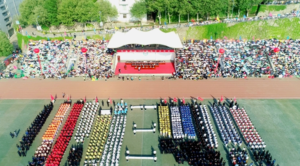 文體表演尾聲,全場(chǎng)師生揮舞著手中小紅旗,共同唱響《我和我的祖國》,齊聲高喊“祖國,我愛你”,把現(xiàn)場(chǎng)氣氛推向高潮。