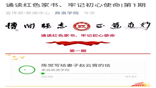 為了豐富“不忘初心、牢記使命”主題教育載體,引導(dǎo)廣大黨員重溫革命歷史、緬懷革命先烈、傳承紅色基因、牢記初心使命,宣傳部遴選了16封感人至深的紅色家書(shū),16個(gè)基層黨總支、直屬黨支部組織黨員代表深情誦讀,并錄制音頻。誦讀作品包括家書(shū)作者簡(jiǎn)介、家書(shū)原文和讀后感,是革命傳統(tǒng)教育的生動(dòng)素材。目前,部分誦讀作品已制作完成,為擴(kuò)大教育覆蓋面,今日起將通過(guò)“商洛學(xué)院”微信公眾號(hào)《誦讀紅色家書(shū) 牢記初心使命》欄目陸續(xù)推送,推送內(nèi)容除音頻外,還配有相關(guān)圖片和文字介紹。