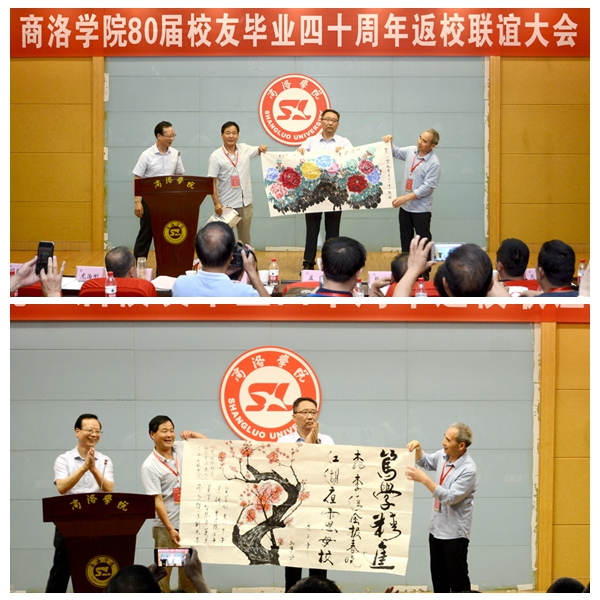 商洛學(xué)院80屆校友總聯(lián)絡(luò)人孟軍,在聯(lián)誼大會(huì)上代表全體校友感謝學(xué)校對(duì)此次活動(dòng)的重視和支持,并現(xiàn)場(chǎng)贈(zèng)送《桃李清風(fēng)報(bào)春曉·江湖夜雨思母校》《牡丹圖》等書畫作品表達(dá)對(duì)母校的深情厚意。他在發(fā)言中表示,憶往昔,歲月崢嶸,母校承載了一代人的青春時(shí)光,不管如今身在何方,故土的鄉(xiāng)情、母校的恩情、師生的友情都絕不能忘;看今朝,倍加珍惜,80屆校友們親身經(jīng)歷了祖國(guó)改革開放40年的發(fā)展變化、親眼目睹了母校翻天覆地的發(fā)展壯大,這些來之不易的成果需要我們共同呵護(hù)珍惜;講未來,豪情滿懷,如今的祖國(guó)屹立于世界之林,揚(yáng)起了大國(guó)的風(fēng)帆,如今的商洛學(xué)院作為陜西省“一流學(xué)院”建設(shè)單位,已成長(zhǎng)為一棵枝繁葉茂的大樹,站在新時(shí)代的節(jié)點(diǎn)展望未來的發(fā)展,我們信心滿滿。衷心祝愿祖國(guó)的明天更美好、母校的未來錦繡如花。