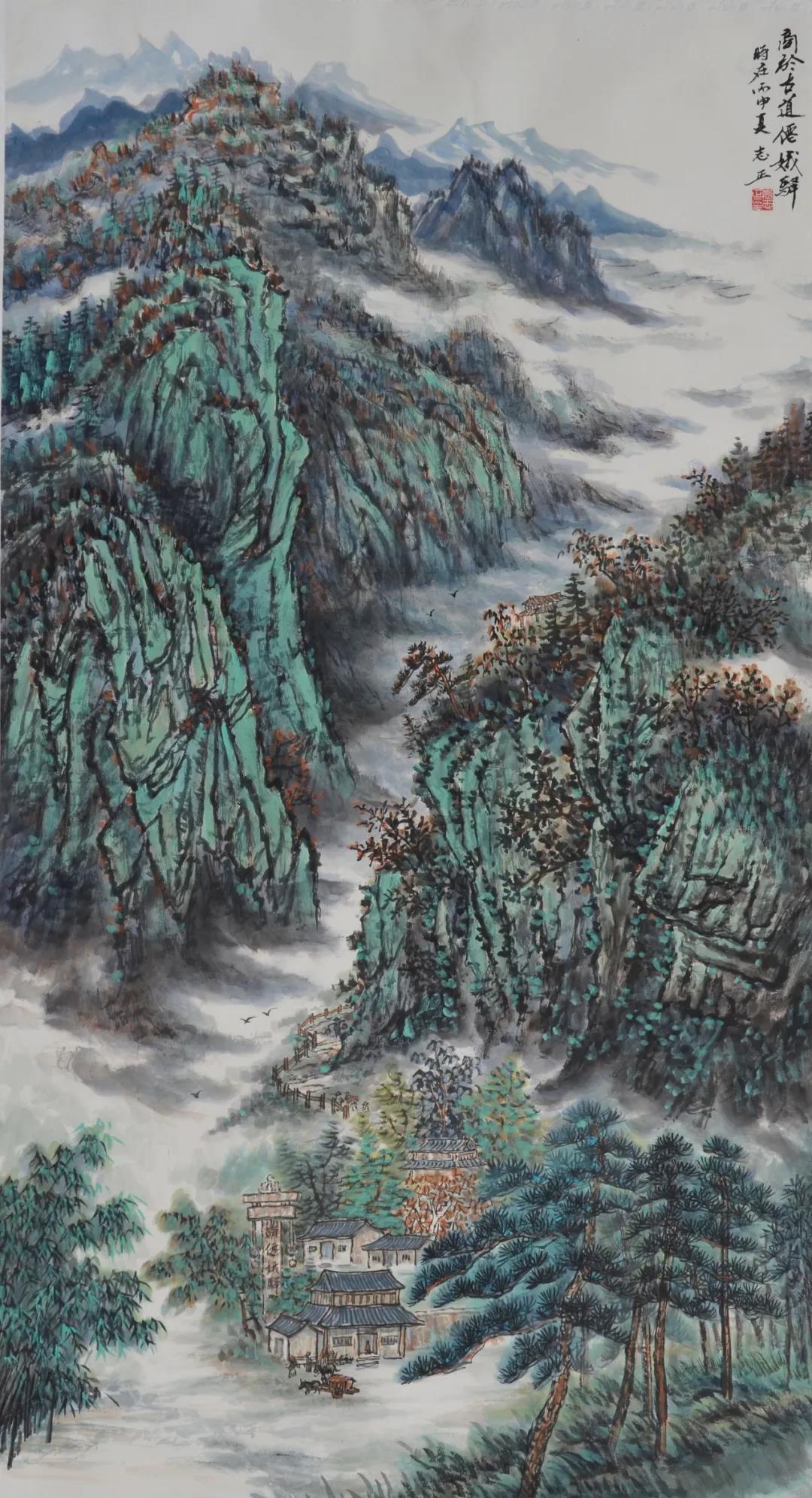 本次布展別出心裁,用原風(fēng)原貌的秦嶺鄉(xiāng)村建筑元素分隔空間,場(chǎng)景與作品相呼應(yīng),讓觀者身臨其境,一步一景。展出的60余件寫生作品和20余件創(chuàng)作作品,有巨制、小品、山水、人物、書法,筆觸疏密有致,筆墨生動(dòng)有趣,不僅可賞“天地之大美”,亦可探“一枝一葉總關(guān)情”,既有表現(xiàn)大美山河的十米長(zhǎng)卷《溪山清遠(yuǎn)圖》、飽含哲理的《丹崖高秋》《山那邊》等畫作,也有謳歌祖國美麗山河的《華山勝景圖》《晴云暖照漫川關(guān)》等作品。其中,小幅寫生作品畫面靜雅、恬淡,充滿平淡天真的氣氛,其他作品多體現(xiàn)北派山水的堂堂君子風(fēng)范,展現(xiàn)了大秦嶺氣勢(shì)磅礴的風(fēng)貌特質(zhì)。
