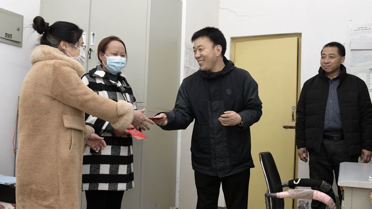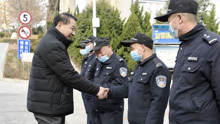 在黨委辦公室·院長辦公室、保衛(wèi)處、后勤保障處和丹江校區(qū)管理處負(fù)責(zé)人的陪同下,彭虎軍一行先后前往北新街校區(qū)和丹江校區(qū)各處門衛(wèi)、教學(xué)樓、圖書館、公寓管理中心、動力中心、體育場值班室和保衛(wèi)處監(jiān)控室等一線崗位,看望慰問正在辛勤工作的值班人員。每到一處,彭虎軍、王新軍都與值班人員親切握手,代表學(xué)校黨政對春節(jié)期間依然奉獻在一線的工作人員表示衷心感謝,并親手送上節(jié)日慰問品。彭虎軍要求全體值班人員一定要把疫情防控和安全穩(wěn)定放在首位,確保在校師生度過一個安全愉快的春節(jié)。