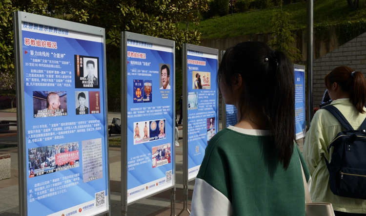 活動最后還組織師生在標語上簽名,掃描關注“中國反邪教”二維碼并進行答題,參觀防范邪教宣傳展板。