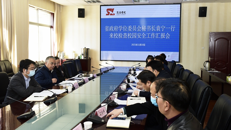 根據(jù)陜西省委教育工委、省教育廳校園安全專項(xiàng)整頓工作安排,11月10日上午,陜西省政府學(xué)位委員會秘書長袁寧,省教育廳研究生處處長張和平、干部成鵬一行3人來到我校,開展校園安全專項(xiàng)檢查工作。校長范新會主持召開工作匯報(bào)會。黨委副書記彭虎軍、副校長王新軍出席匯報(bào)會并陪同檢查。黨委辦公室·院長辦公室、宣傳部、人事處、學(xué)生處、教務(wù)處、保衛(wèi)處、資產(chǎn)管理處、后勤保障處、信息化建設(shè)與管理處相關(guān)負(fù)責(zé)人參加會議。