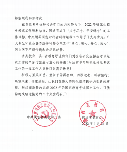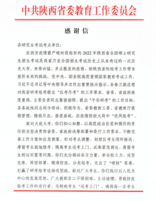 感謝信說,2022年研究生招生考試是我省乃至全國招生考試歷史上從未有過的一次歷史大考,來勢兇猛,多點散發(fā)的疫情給陜西省的組考工作帶來前所未有的挑戰(zhàn),面對大疫大考,我校初心如磐,以高度的政治自覺和強烈的責任擔當堅決貫徹省委、省政府決策部署和委廳工作要求,舉全校之力,攻堅克難,周密部署,精準防疫,分類組考,交出了“硬核”答卷,打贏了考研組考這場攻堅戰(zhàn),圓滿完成了“應考盡考,平安考研”的工作目標。廣大考生和社會各界稱贊各項工作“精心、暖心、安心、放心”,網上網下不斷傳遞升華正能量。
