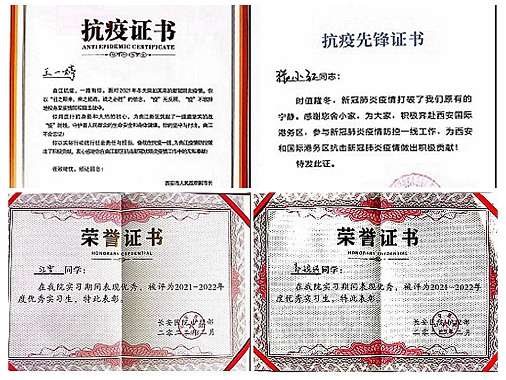 近日,西安曲江新區(qū)和國際港務區(qū)對抗擊新冠肺炎疫情工作中表現(xiàn)突出的工作人員和志愿者進行了表彰。我校王一婷、張小紅、郭江艷、崔晉維、高靜、郭婉婷6名實習生榮獲西安曲江新區(qū)和國際港務區(qū)頒發(fā)的抗疫證書和抗疫先鋒證書。學生江雪榮獲西安國際港務區(qū)頒發(fā)的抗疫先鋒證書。張小紅、郭婉婷及江雪3名實習生被長安醫(yī)院評為“優(yōu)秀實習生”。