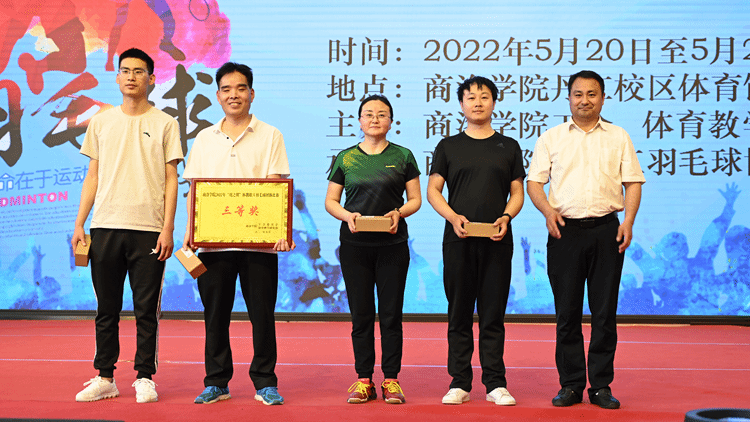 5月20-22日,由校工會(huì)、體育教學(xué)研究部主辦,教職工羽毛球協(xié)會(huì)承辦的2022年“虎之翼”杯教職工羽毛球團(tuán)體賽在丹江校區(qū)體育訓(xùn)練館舉行。校黨委副書(shū)記、工會(huì)主席彭虎軍,商洛市“虎之翼”科技有限公司總經(jīng)理劉珺,商洛學(xué)院附屬小學(xué)副校長(zhǎng)白鋒軍出席頒獎(jiǎng)儀式并為獲獎(jiǎng)代表隊(duì)頒獎(jiǎng)。