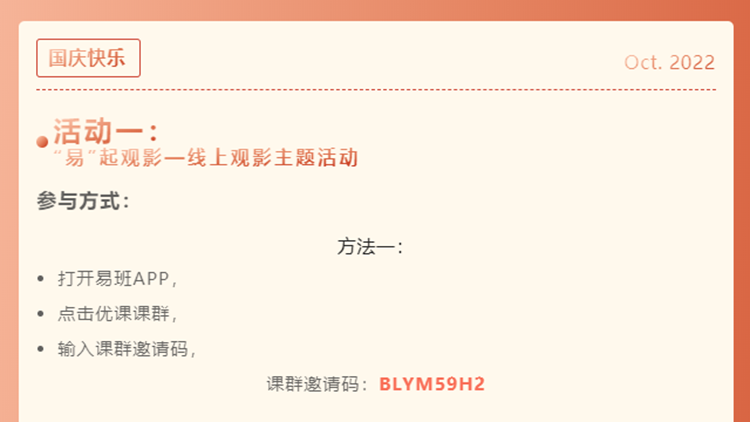 學(xué)生處通過(guò)易班平臺(tái)舉辦了易”起線(xiàn)上觀影、“易”句告白祖國(guó)、“易”起學(xué)習(xí)優(yōu)課等活動(dòng),邀請(qǐng)全校師生觀看紅色電影、抒發(fā)愛(ài)國(guó)之情、參與“喜迎黨的二十大”優(yōu)課課群答題,重溫黨的百年征程波瀾壯闊,感受百年黨史篳路藍(lán)縷和百年初心歷久彌堅(jiān)。
