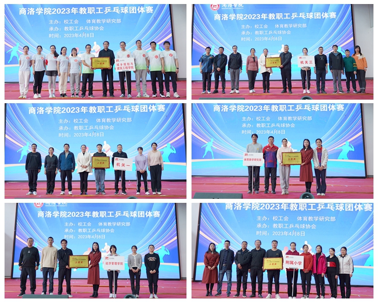 4月8日,我校2023年教職工乒乓球團(tuán)體賽在丹江校區(qū)體育館順利舉行。來自學(xué)校各工會(huì)分會(huì)以及商洛學(xué)院附屬小學(xué)、附屬幼兒園的17支代表隊(duì),包括運(yùn)動(dòng)員、裁判員及教練200余人參加了比賽。副校長王新軍、商洛學(xué)院附屬小學(xué)校長趙阿玲、附屬幼兒園園長劉莉莉出席活動(dòng)并為獲獎(jiǎng)代表隊(duì)頒獎(jiǎng)。工會(huì)及體育教學(xué)研究部相關(guān)負(fù)責(zé)人參加活動(dòng)。
