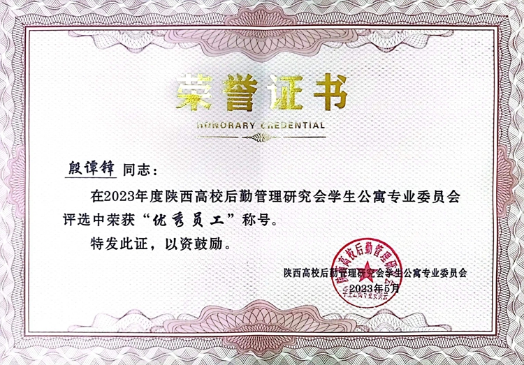 會(huì)上,陜西高校學(xué)生公寓專業(yè)委員會(huì)秘書長(zhǎng)賈亞新宣讀了《2023年度陜西高校學(xué)生公寓先進(jìn)集體、服務(wù)標(biāo)兵、優(yōu)秀員工》的表彰決定。我校后勤保障處獲得“陜西高校學(xué)生公寓先進(jìn)集體”榮譽(yù)稱號(hào),后勤保障處副處長(zhǎng)殷譚鋒被評(píng)為陜西高校學(xué)生公寓“優(yōu)秀員工”,后勤保障處職工王鎖鋒被評(píng)為陜西高校學(xué)生公寓“服務(wù)標(biāo)兵”。后勤保障處處長(zhǎng)李彥廣作為嘉賓之一為優(yōu)秀員工代表頒發(fā)獎(jiǎng)狀。