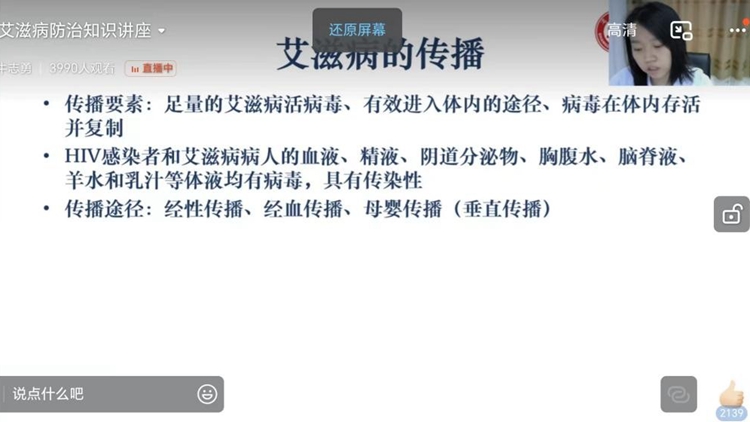 為了提高我校學(xué)生對艾滋病的認(rèn)識,普及艾滋病預(yù)防知識,6月24日晚,校醫(yī)院以“青春自護(hù),知愛防艾——立即行動,向‘零’艾滋邁進(jìn)”為主題,通過釘釘直播的方式為在校學(xué)生開展專題知識講座。校醫(yī)院醫(yī)務(wù)人員及4000余名學(xué)生在線參加講座。
