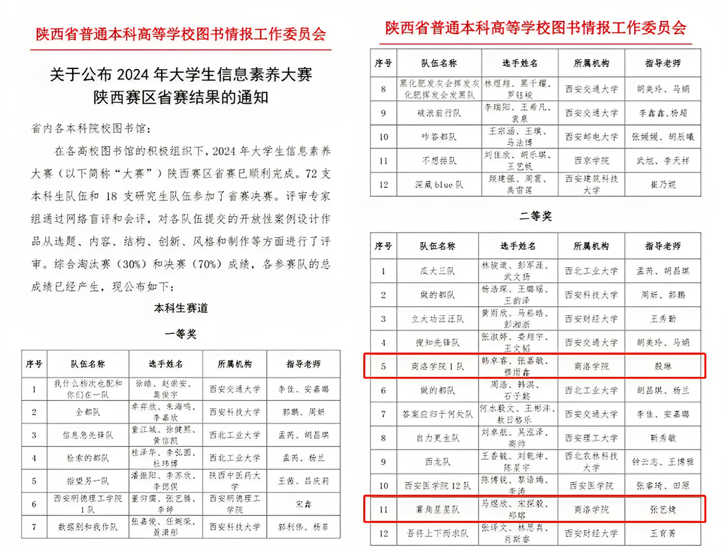 近日,2024年大學(xué)生信息素養(yǎng)大賽陜西賽區(qū)省賽結(jié)果公布,商洛學(xué)院2支參賽隊(duì)伍榮獲本科生賽道二等獎(jiǎng)。