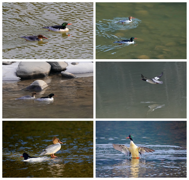 據(jù)張博介紹,12月10日,他在與山陽縣野生動物和天然林保護管理中心(以下簡稱“天保中心”)工作人員合作開展河流、濕地動物類群調(diào)查。在進行調(diào)查勘察路線時,發(fā)現(xiàn)2只中華秋沙鴨在水中慢游。張博立即從遠處開始拍攝,隨后越過層層緩坡,走到河邊抵近觀察拍攝。順流而下的中華秋沙鴨發(fā)現(xiàn)工作人員后反轉(zhuǎn)方向逆流而上,其余5只在工作人員剛下車時受到驚嚇馬上起飛,工作人員有幸拍到了照片。