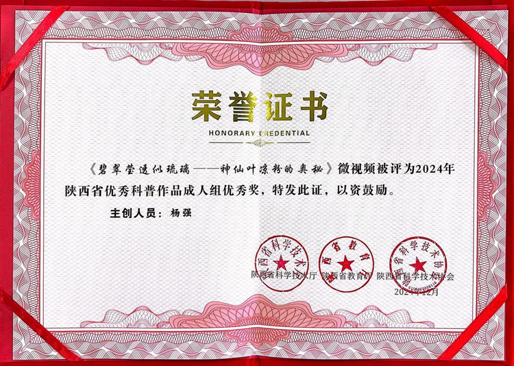 近日,陜西省科技廳、陜西省教育廳、陜西省科協(xié)聯(lián)合舉辦的2024年陜西省優(yōu)秀科普作品征集活動公布了獲獎結(jié)果,我?;膶W(xué)院教師楊強制作的科普作品《碧翠瑩透似琉璃——神仙葉涼粉的奧秘》榮獲陜西省優(yōu)秀科普微視頻作品成人組優(yōu)秀獎。