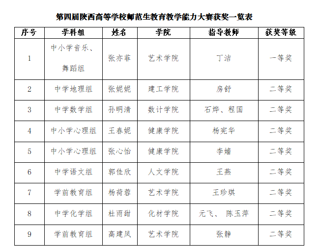 近日,陜西省教育廳公布了第四屆陜西高等學(xué)校師范生教育教學(xué)能力大賽獲獎名單。我校獲得一等獎1項、二等獎8項,獲獎數(shù)量再創(chuàng)新高。