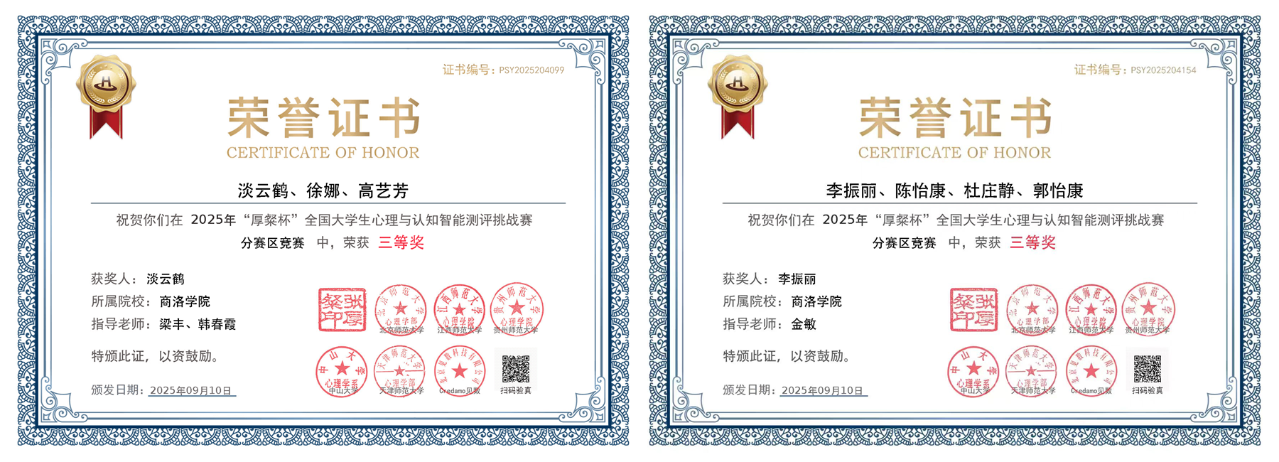 近日,由教育部高等學(xué)校心理學(xué)類專業(yè)教學(xué)指導(dǎo)委員會(huì)、全國大學(xué)生心理測量賽事聯(lián)盟主辦,北京師范大學(xué)等單位承辦的2025年“厚粲杯”全國大學(xué)生心理與認(rèn)知智能測評(píng)挑戰(zhàn)賽西部賽區(qū)比賽圓滿落幕,我校教育科學(xué)學(xué)院應(yīng)用心理學(xué)專業(yè)2支參賽隊(duì)伍均榮獲三等獎(jiǎng),為省內(nèi)同類院校最好成績,充分展現(xiàn)了我校應(yīng)用心理學(xué)專業(yè)人才培養(yǎng)成效。
