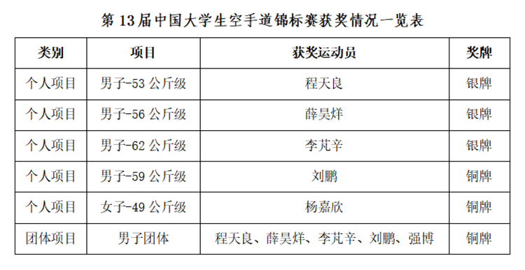 近日,在浙江省溫州市永嘉縣舉行的第13屆中國大學(xué)生空手道錦標(biāo)賽上,我校空手道代表隊(duì)奮勇拼搏、發(fā)揮出色,共獲得3枚銀牌、2枚銅牌及男子團(tuán)體銅牌。隊(duì)員范思宇榮獲“優(yōu)秀運(yùn)動(dòng)員”稱號(hào),體育教學(xué)研究部教師桑國鵬獲評(píng)“優(yōu)秀教練員”。