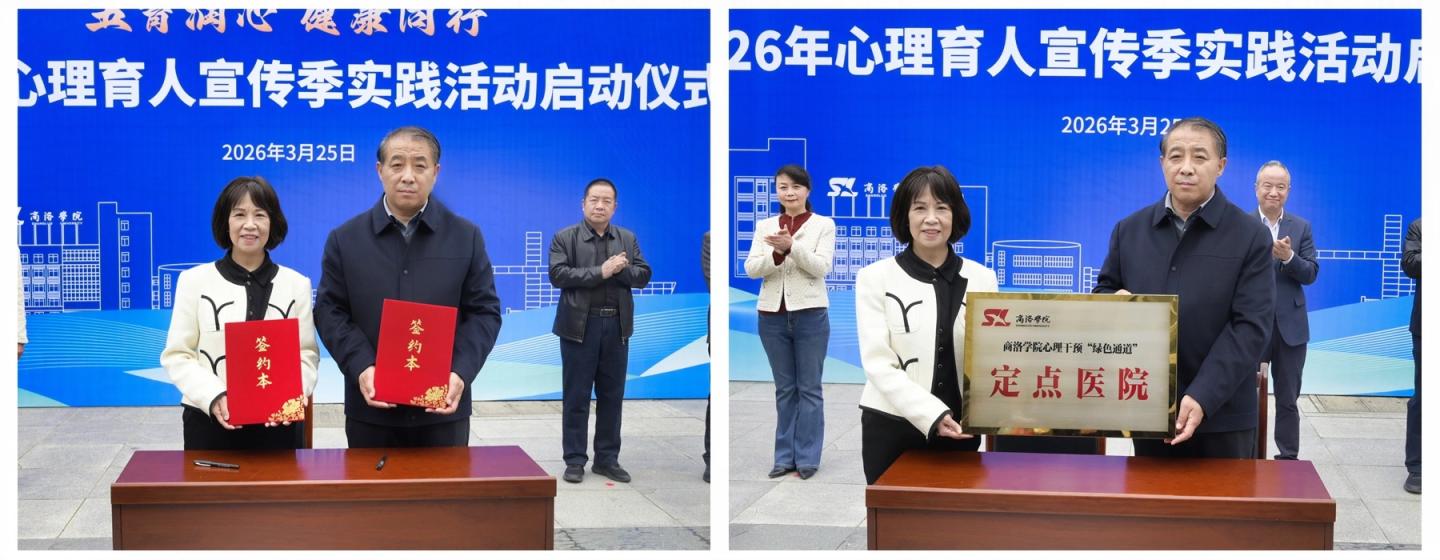 在參會領導與師生的共同見證下,王新軍與陳建玲代表雙方簽訂《商洛學院與商洛市中心醫(yī)院合作協(xié)議》并現(xiàn)場授牌,標志著商洛市中心醫(yī)院正式成為“商洛學院心理干預‘綠色通道’定點醫(yī)院”